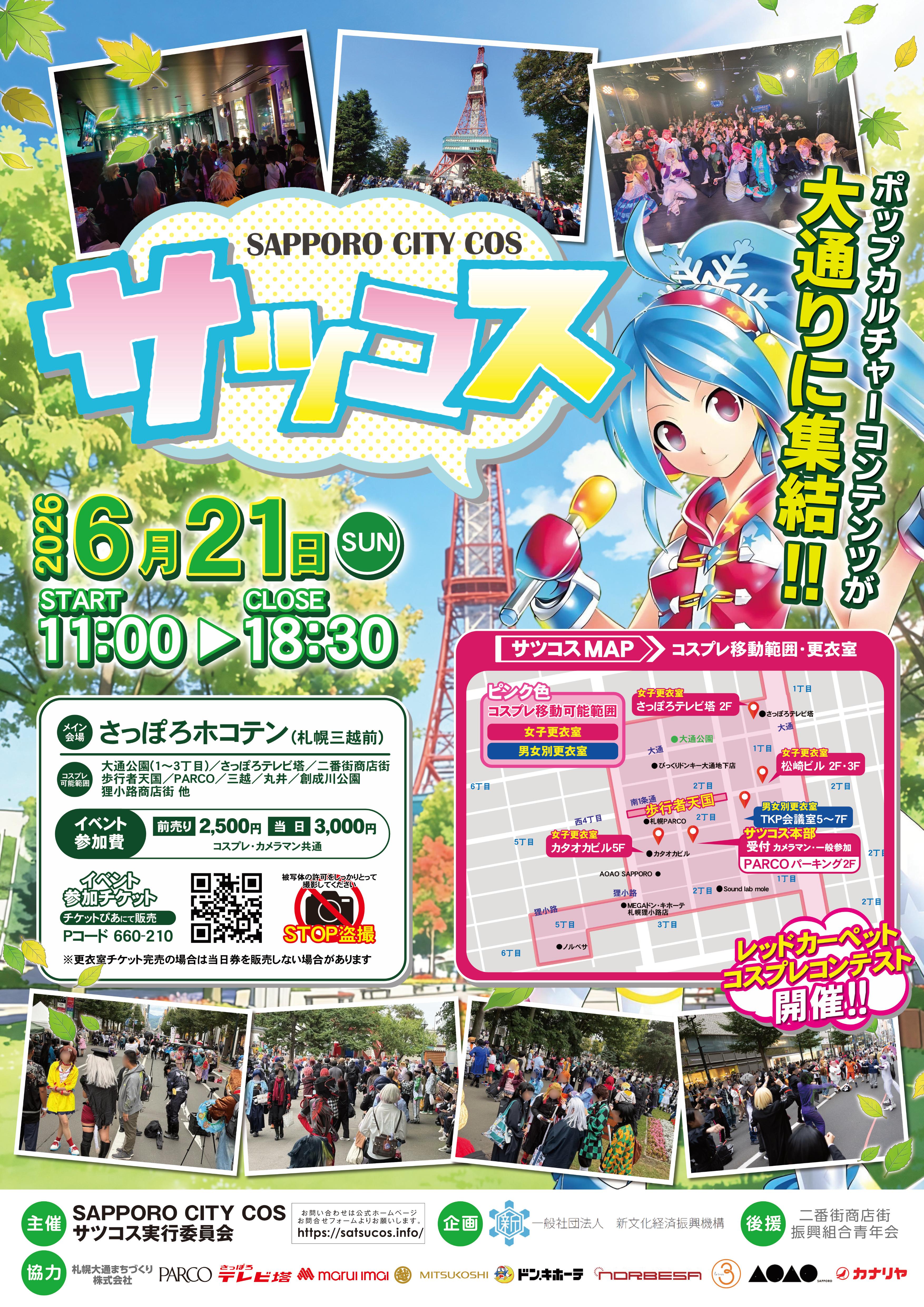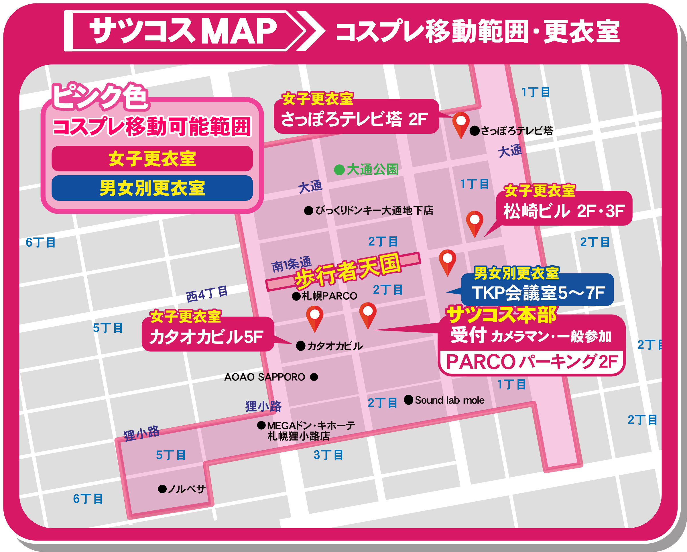 【コスプレ行動可能※撮影はNGですがコスプレのまま移動はOK】会場図ピンク枠内 【撮影OK】大通公園1~3丁目 創成川公園 サッポロホコテン ノルベサ7階&観覧車 テレビ塔展望台 など 【撮影NG】車道 歩道 更衣室内 トイレ 店舗 ※店主より許可があればOK |